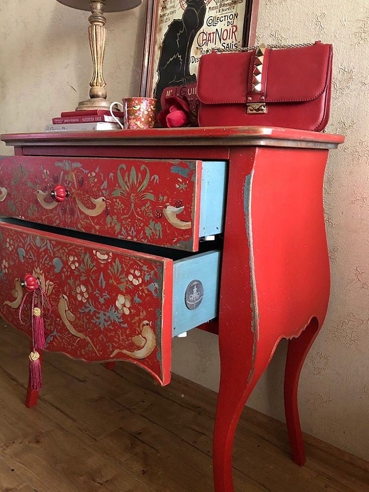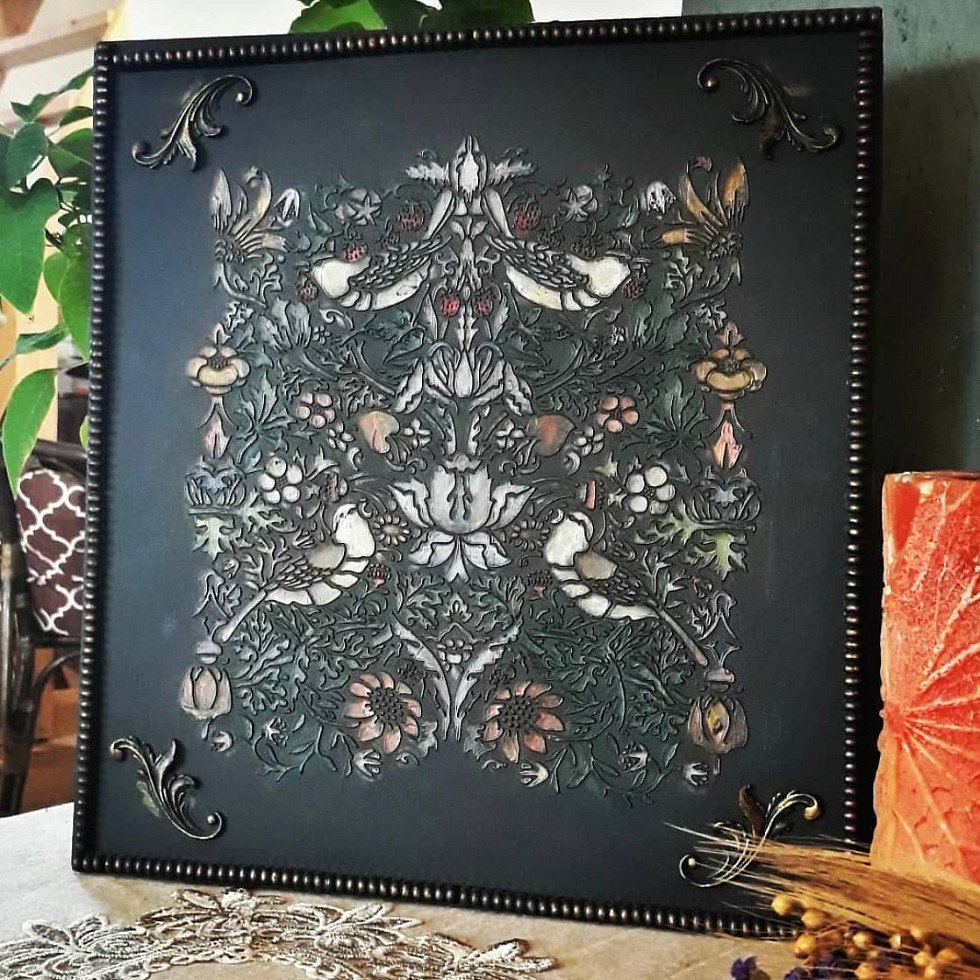 Волшебный по своей красоте трафарет, такие мельчайшие детали! Любой неказистый предмет с этим трафаретом будет выглядеть восхитительно! У меня пока не хватает умения работать с такой красотой, и трафарет немного получился смазанным, но, как ни странно, этому трафарету ничего не страшно! В смазанном виде эффект получился более винтажным! Мне очень понравилось!
