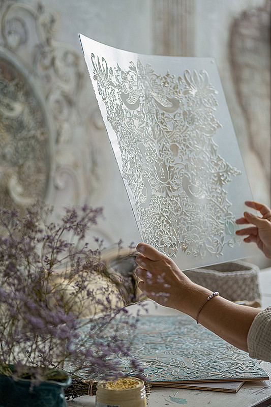 Великолепный трафарет. Чёткий рисунок, большое количество деталей делает его насыщенным, но не перегруженым. Очень удобный размер. С лёгкостью наносила на мелкие детали и на мебельный фасад.