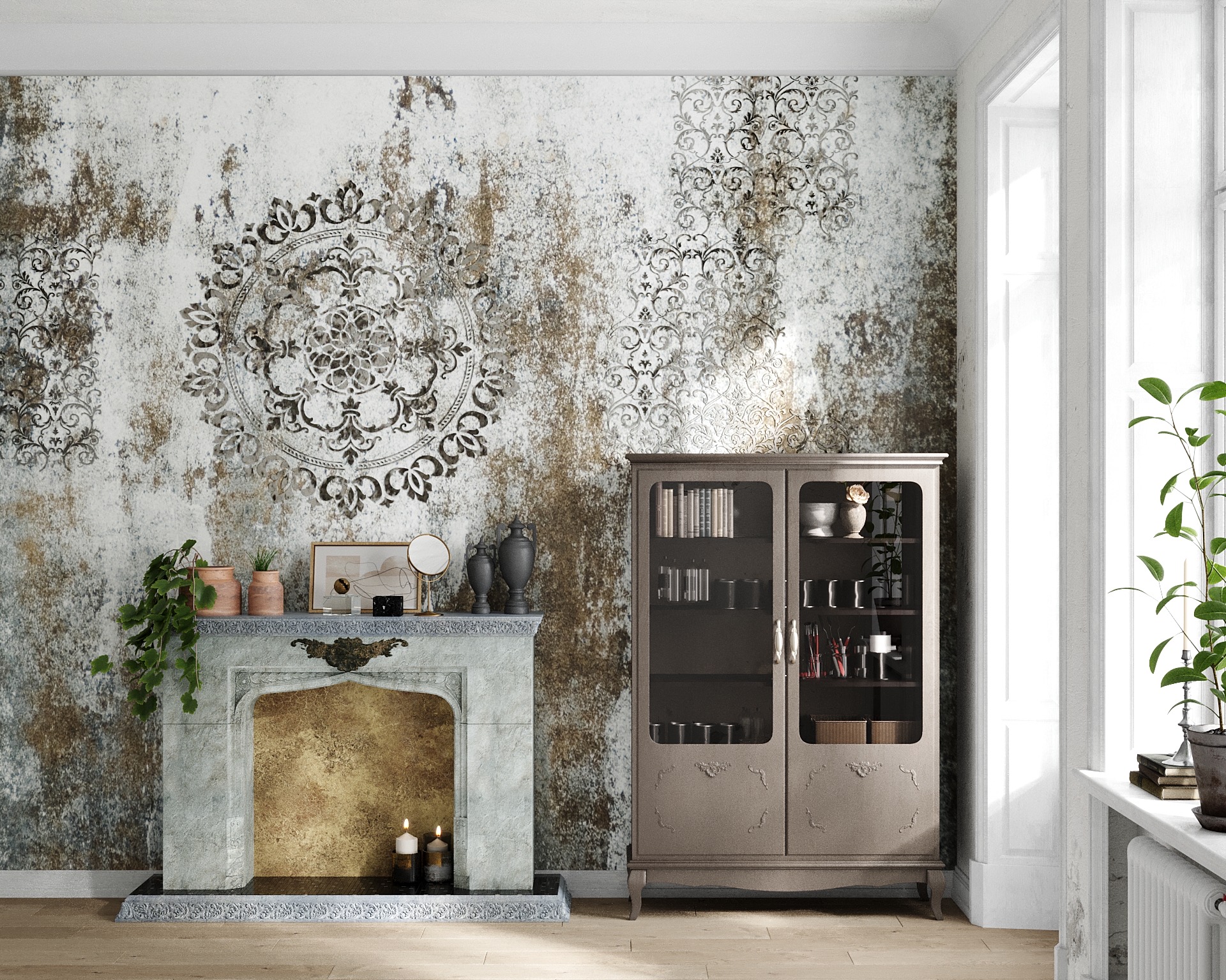 Этот трафарет моя особая Любовь! С помощью штукатурки наносила рисунок с помощью этого трафарета на стену, декорировала дверки на шкафу, тоже объёмный рисунок. Декорировала чехлы для подушек с помощью текстильной краски. Рисунок получается очень ажурным. На стене выглядит будто кружево.